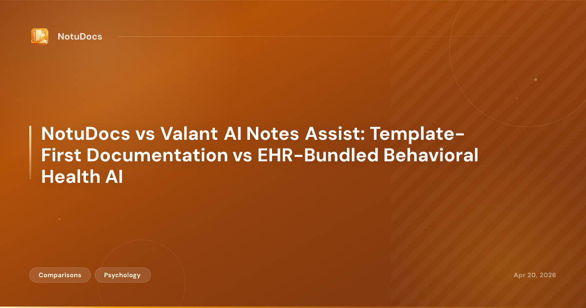 A direct comparison of NotuDocs ($25/mo standalone) and Valant AI Notes Assist ($100-300/provider/month EHR bundle) for behavioral health professionals. Covers workflow differences, EHR dependency, pricing, template control, privacy considerations, and which type of practice each tool actually serves.