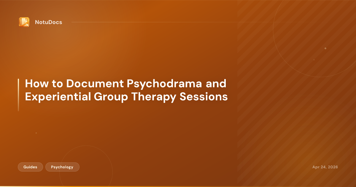 A practical guide for psychodrama directors and experiential group therapists on documenting the warm-up, action, and sharing phases, protagonist work, auxiliary roles, sociometry, and group dynamics. Covers billing documentation, CPT codes for group sessions, consent considerations for action-based methods, and progress tracking across sessions.