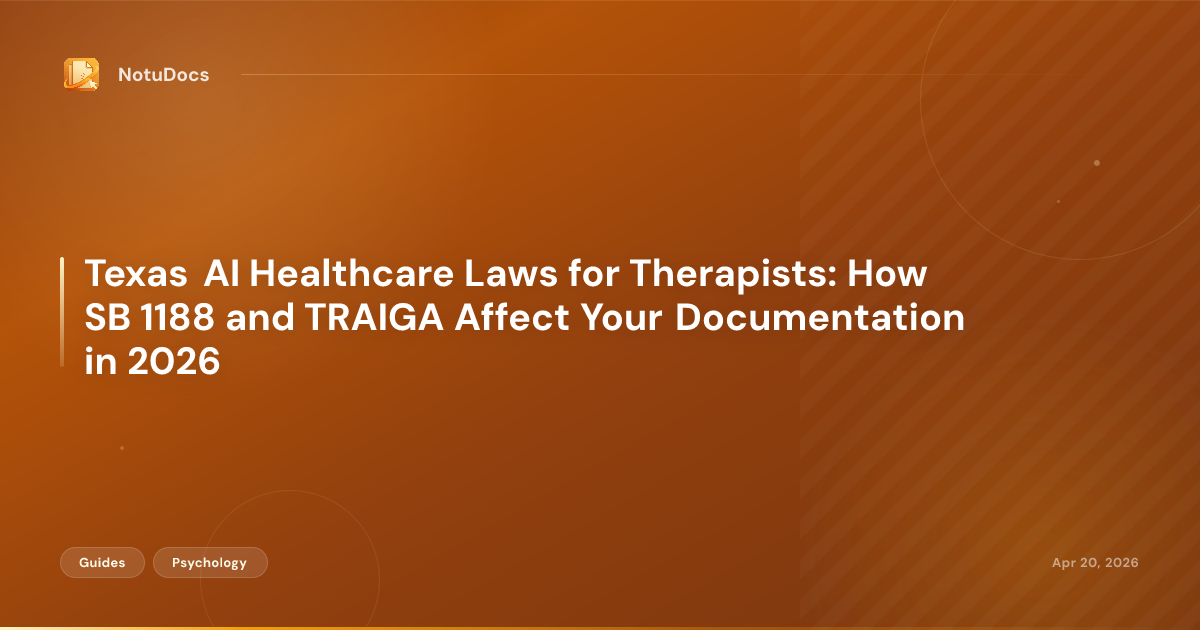 Texas enacted two AI laws that now govern how therapists can use AI documentation tools: SB 1188 (effective September 2025) and TRAIGA/HB 149 (effective January 2026). This guide explains what each law requires, how they interact, and what compliance looks like in a real therapy practice.
