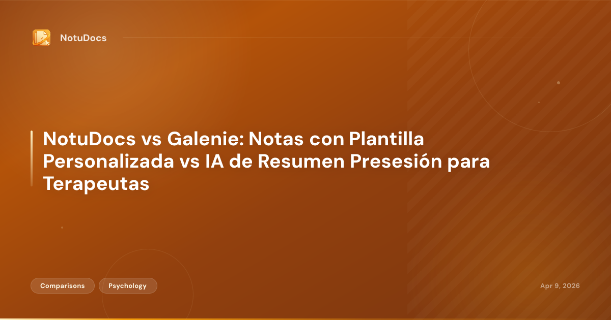 Comparación directa de NotuDocs ($25/mes, plantilla primero) y Galenie (plataforma de gestión de práctica con IA para terapeutas en Europa y EE.UU.). Cubre flujo de trabajo, niveles de precios, GDPR vs HIPAA, control de plantillas y para quién es cada herramienta.