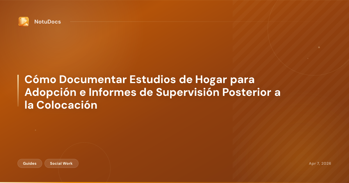 Guía práctica para trabajadores sociales y profesionales de adopción sobre cómo documentar estudios de hogar e informes de supervisión posterior a la colocación que cumplan con los requisitos estatales y de la agencia. Abarca los componentes de la evaluación psicosocial, la documentación de preocupaciones de seguridad, cómo escribir sin editoralizar y los errores comunes que retrasan o frustran los procesos de adopción.