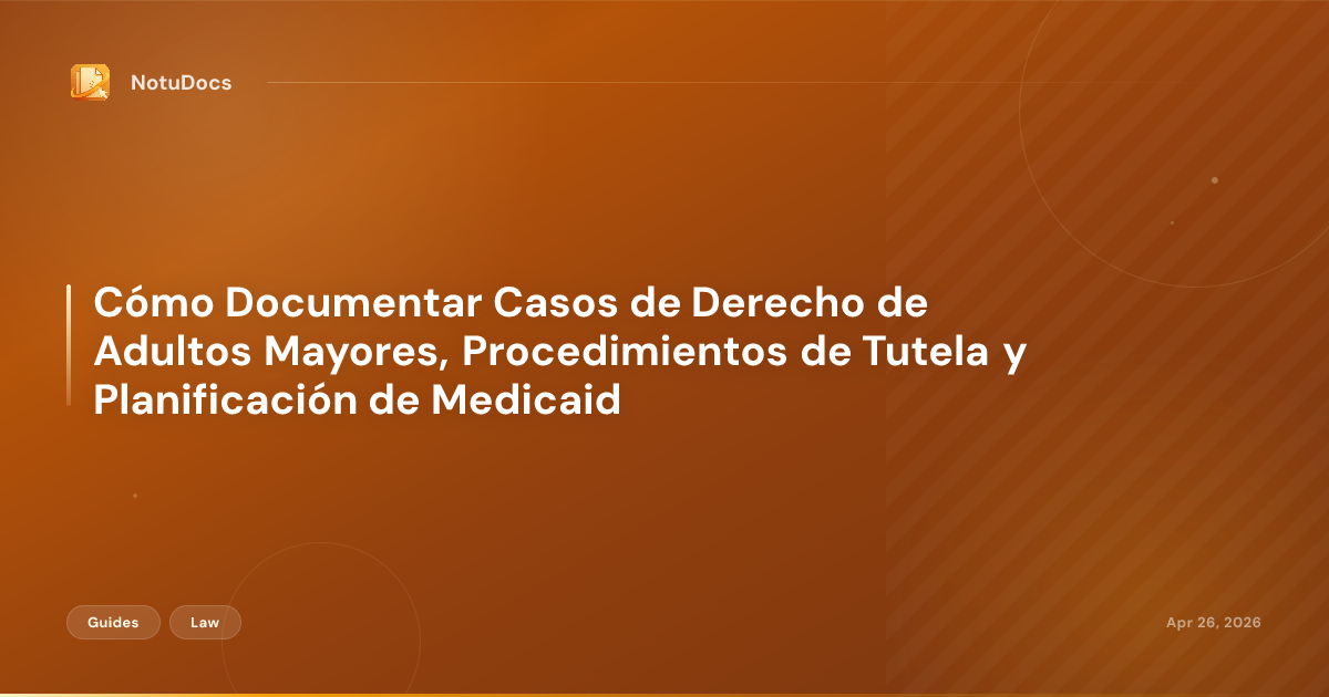 Esta guía cubre las prácticas específicas de documentación para toda la gama del derecho de adultos mayores: consultas iniciales con clientes ancianos, procedimientos de tutela y curatela, expedientes de planificación de Medicaid, asesoramiento sobre poderes notariales y directivas anticipadas, coordinación de cuidados a largo plazo, investigaciones de explotación financiera y las obligaciones éticas que atraviesan todos estos ámbitos.