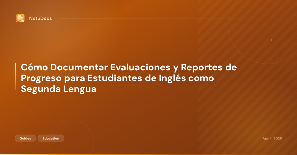 Guía práctica para docentes de ESL/ELL, especialistas en educación bilingüe y administradores escolares sobre la documentación de servicios para estudiantes de inglés como segunda lengua. Cubre evaluaciones iniciales de dominio del idioma, decisiones de colocación, monitoreo de progreso, reportes de evaluación anual, criterios de reclasificación, notificaciones en el idioma del hogar, cumplimiento del Título III y documentación para estudiantes con identificación dual (ELL e IEP/504).