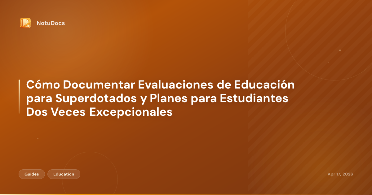 Esta guía está organizada en torno a esas cuatro funciones. Cubre la documentación de evaluaciones cognitivas y de rendimiento académico, los perfiles de estudiantes dos veces excepcionales (2e), la intersección entre los planes de superdotados y los IEP o planes 504, la planificación de la diferenciación, las decisiones de aceleración, la documentación socioemocional, la comunicación con las familias y el seguimiento del progreso. Dos estudiantes ficticios aparecen como ejemplos a lo largo del texto.