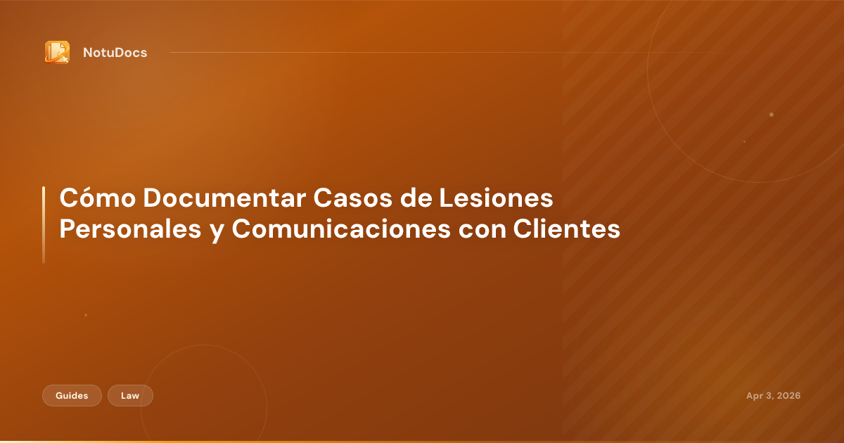 Esta guía está dirigida a abogados de lesiones personales que trabajan solos o en firmas pequeñas, así como a paralegales que necesitan un sistema práctico para documentar cada caso desde la primera llamada hasta el acuerdo o juicio. El enfoque está en qué documentar, qué formato usar y qué se omite con mayor frecuencia.