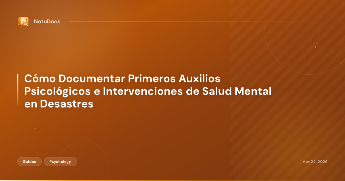 Guía práctica de documentación para clínicos que brindan primeros auxilios psicológicos en situaciones de desastre, accidentes masivos o crisis comunitarias. Cubre la distinción entre documentación de PAP y terapia clínica, notas de triaje de campo, registros de estabilización, seguimiento de derivaciones, requisitos del Programa de Orientación en Crisis de FEMA, normas de reporte de Cruz Roja y SAMHSA, y consideraciones legales y éticas propias de la respuesta a desastres.