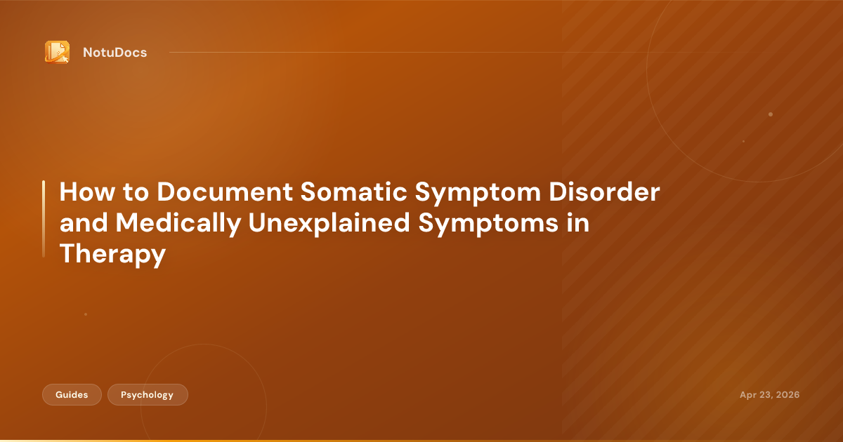 A practical guide for therapists documenting treatment of somatic symptom disorder (SSD), illness anxiety disorder, and functional symptoms. Covers psychological formulation, trauma-informed language, functional outcome tracking, medical provider coordination, CBT and ACT intervention documentation, insurance justification, and distinguishing SSD from malingering.